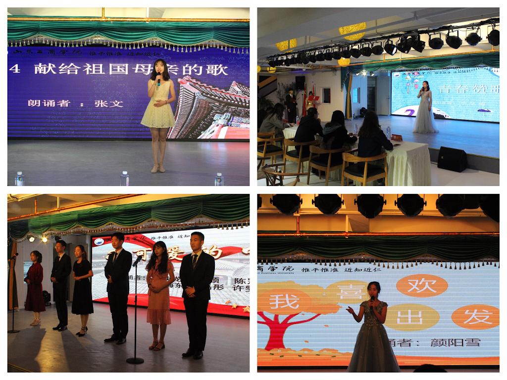 经过初赛和复赛选拔,7支队伍进入决赛。比赛现场,同学们围绕主题,向在场师生和市民朋友们做了声情并茂的朗诵。最终,“waiting bar”团队的《校园日记》、颜阳雪同学的《我喜欢出发》获一等奖,“心颂”团队的《可爱的中国》、张文同学的《献给祖国母亲的歌》获二等奖,“沐华”团队的《一晃一季,一季一年》、王思泽同学的《再别康桥》获三等奖,李冬梅同学的《青春赞歌》获最佳风采奖。