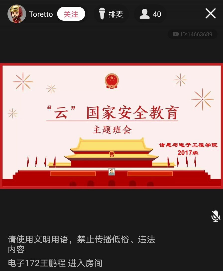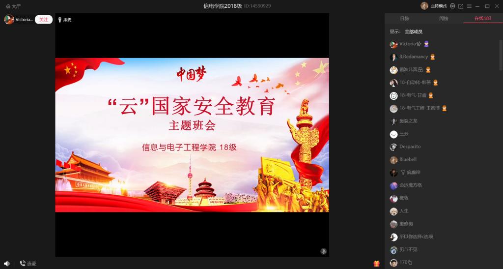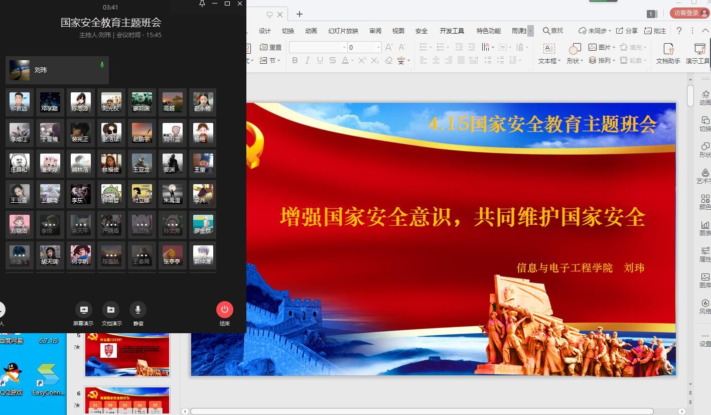 信息与电子工程学院各个年级辅导员召开“云”国家安全教育主题班会,强化大学生的国家安全教育。在班会上,辅导员从国家安全教育日的由来、重要意义和大学生应该怎么做三个方面向同学们讲述了国家安全的相关知识。对同学的国家安全教育知识掌握提出要求:作为大学生,必须提高自身素质,把促进国家安全与稳定贯穿平时学习、生活中,并且始终树立国家安全高于一切的意识,掌握国家相关的安全法规,坚决抵制损害国家安全的行为!