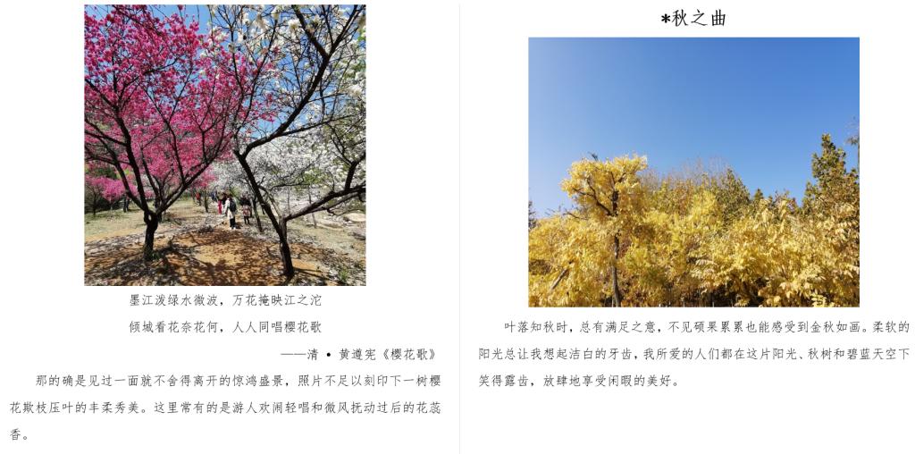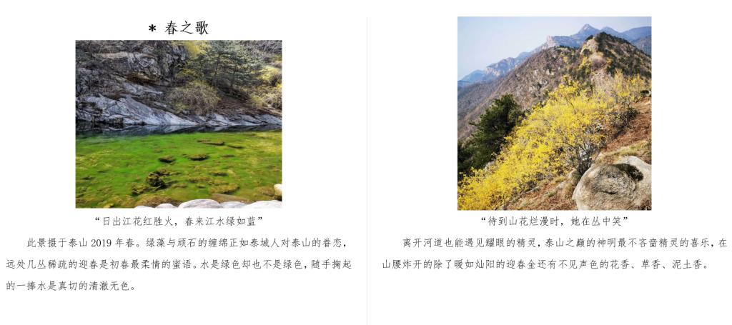 信电学子积极响应本次活动,经收集整理选出了一部分较为优秀的作品进行展示。一篇文章将泰山的四季生动表达:春之清扬、夏之明朗、秋之冷瑟、冬之凛冽;延吉虽然是一个小小的四线城市,但是在信电学子的笔下,它的美食和景色无不令人向往;有时候身边的景色往往被人忽视,但仍有同学拥有一双善于发现美的眼睛,将之记录下来。