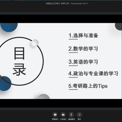 主讲同学分别就大家关心的问题,从考研复习方式、时间规划、跨考以及择校等几个方面进行分享交流。考研复习方面,主讲同学分享了每一考试科目的复习方式,包括资料选择、复习进度安排等;跨考方面,分享如何选择跨考专业及如何准备;择校问题方面,指导同学们了解如何选择院校、选择哪种类型院校等;时间规划与心态调整方面,就如何自我排解考研过程中压力进行了深入交流。