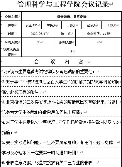 6月18日,管理科学与工程学院面向全体学生于线上开展“坚守诚信,共同抗疫”主题云班会。
