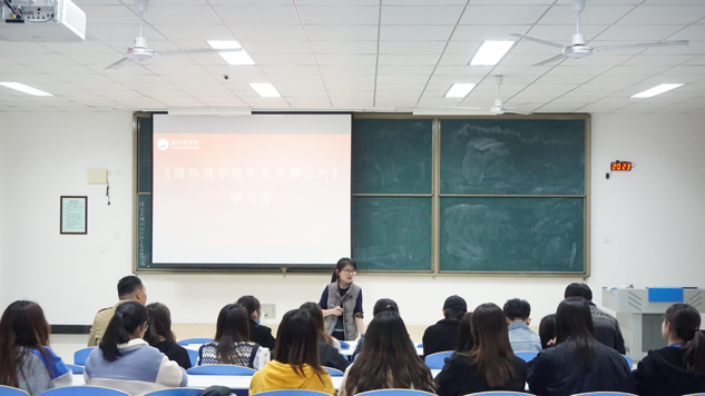 11月12日,国际商学院在逸夫楼组织学习《学生干部公约》。我院分团委副书记杨春娟出席,学生骨干代表等二十余人参加。