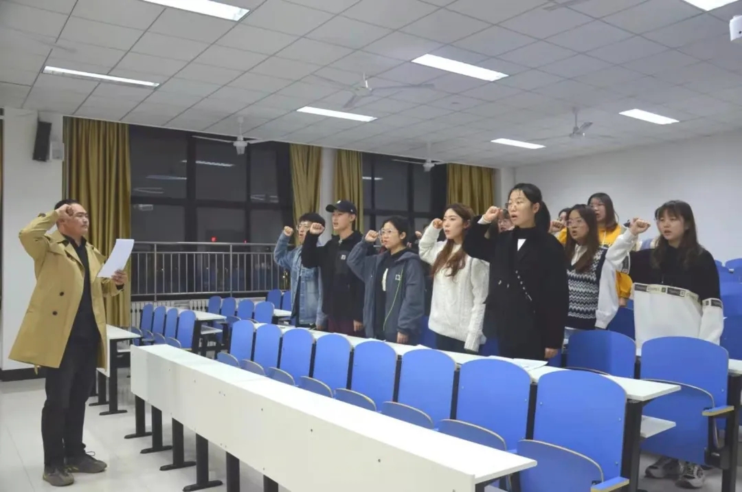 杨老师带领学生认真学习我院针对“学生会干部官威大”热点问题而制定的《学生干部公约》,强调学生会要全心全意为同学服务,摒弃官僚作风。为落实到行动,学生会主席赵鑫喆带领成员进行庄严宣誓。