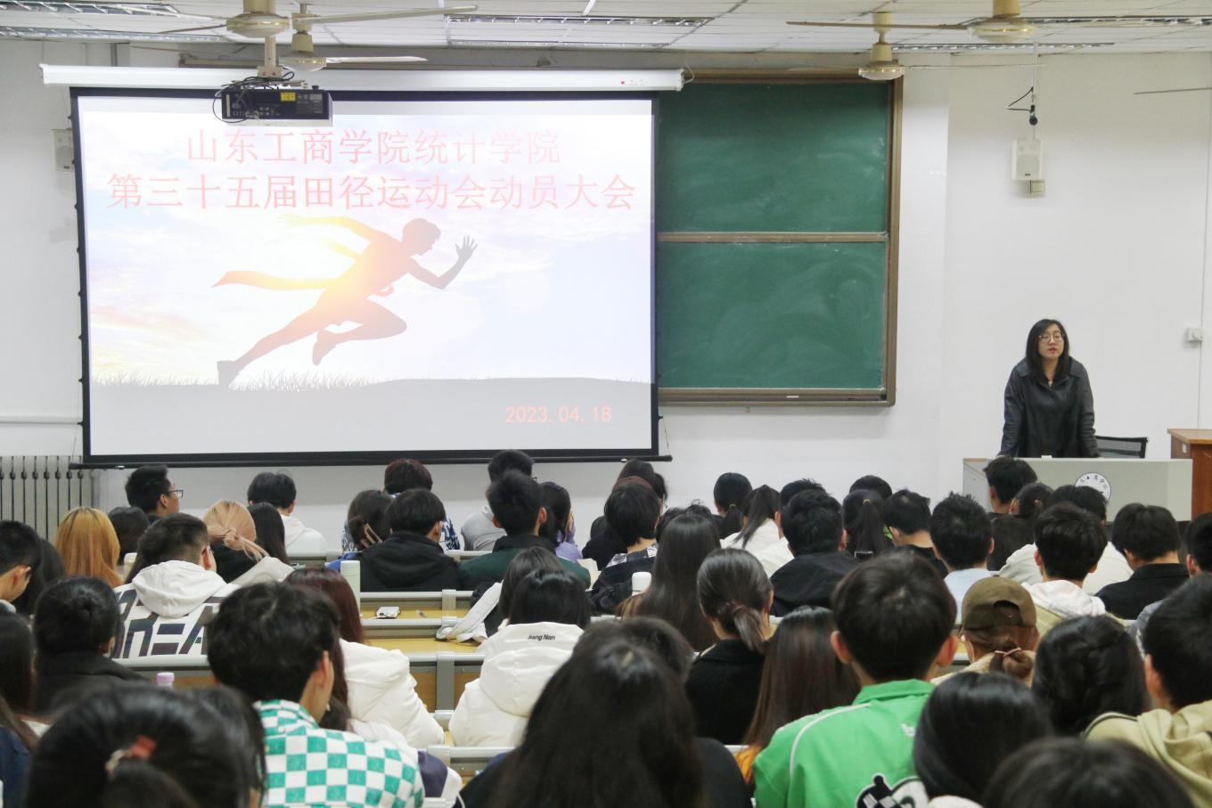 4月18日,统计学院在二教开展春季运动会动员大会。王俊梅老师、学生会负责人王浩丞、楚天博和2022级全体同学100余人参加,王俊梅老师主持。