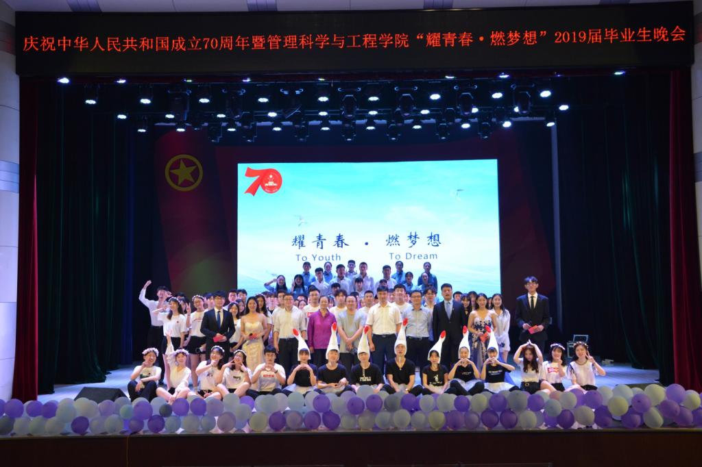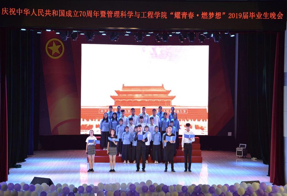 6月16日晚,管理科学与工程学院在艺术中心一楼礼堂举办了庆祝中华人民共和国成立70周年暨“耀青春•燃梦想”2019届毕业生晚会。