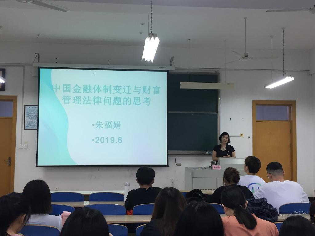 6月11号晚七点,法学院举办了以“中国金融体制变迁与财富管理法律问题的思考”为主题的讲座。山东工商学院法学院朱福娟副教授担任主讲嘉宾,由法学院副院长武善学主持,2017级全体学生参加了此次讲座。