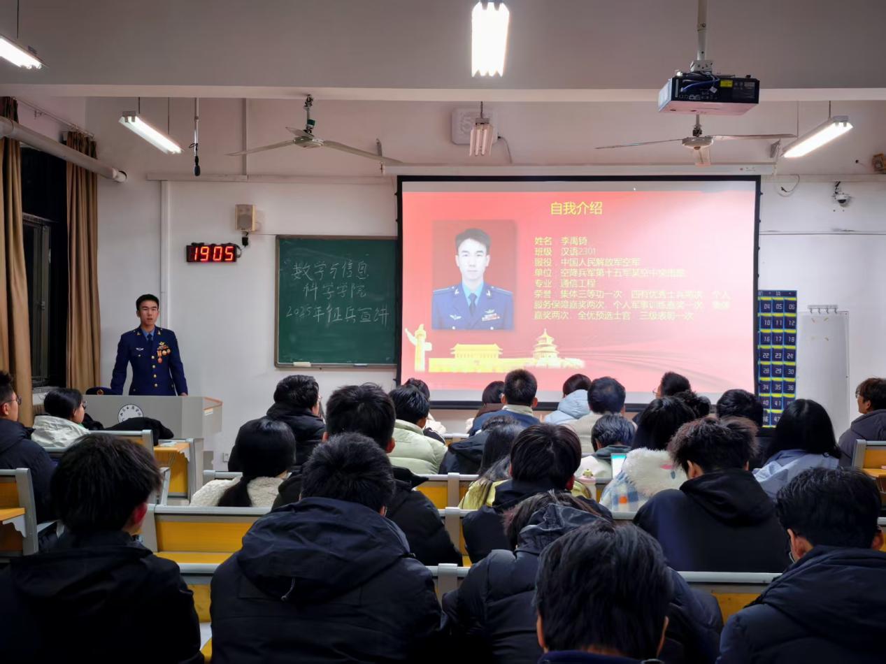 为积极响应国家征兵号召,激发青年学子参军报国热情,学校于2025年11月组织开展校园征兵宣讲活动。活动采取政策解读与经历分享相结合的形式,为有意向参军的学生搭建精准服务平台,为强军兴国事业注入青春动能。