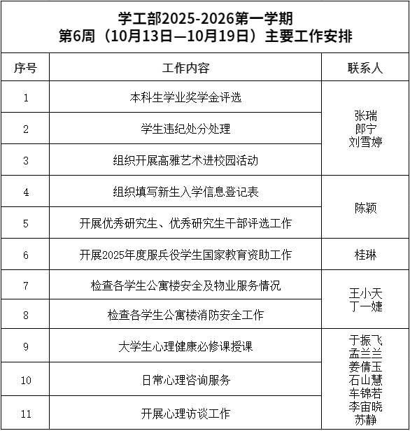学工部2025-2026第一学期第6周(10月13日-10月19日)主要工作安排