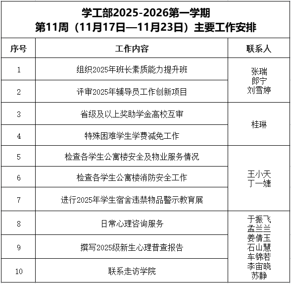 学工部2025-2026第一学期第11周(11月17-11月23日)主要工作安排