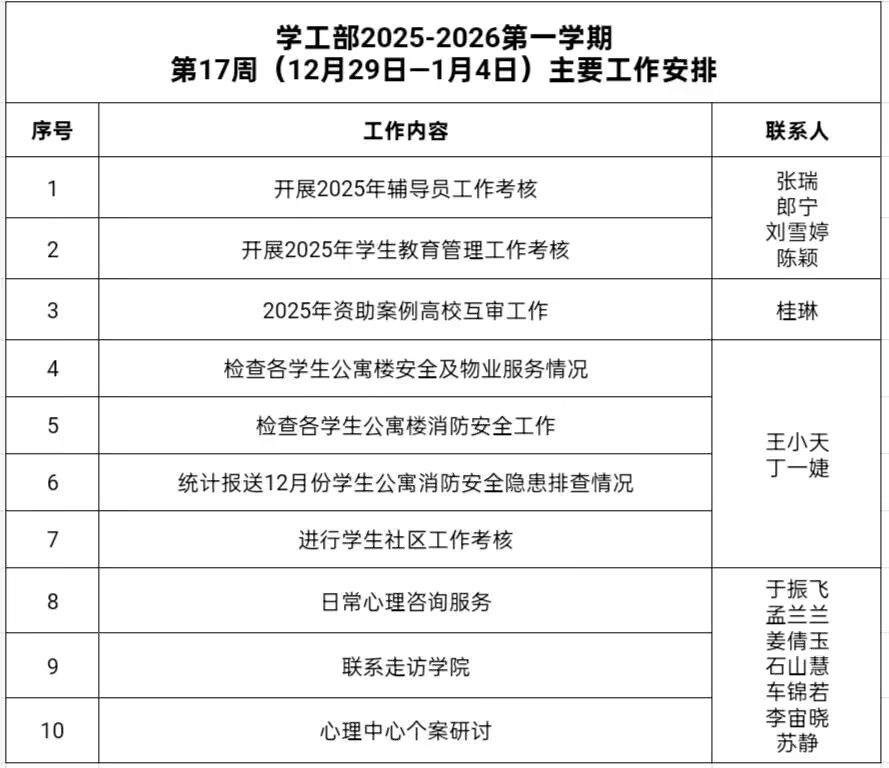 学工部2025-2026第一学期第17周(12月29日-1月4日)主要工作安排