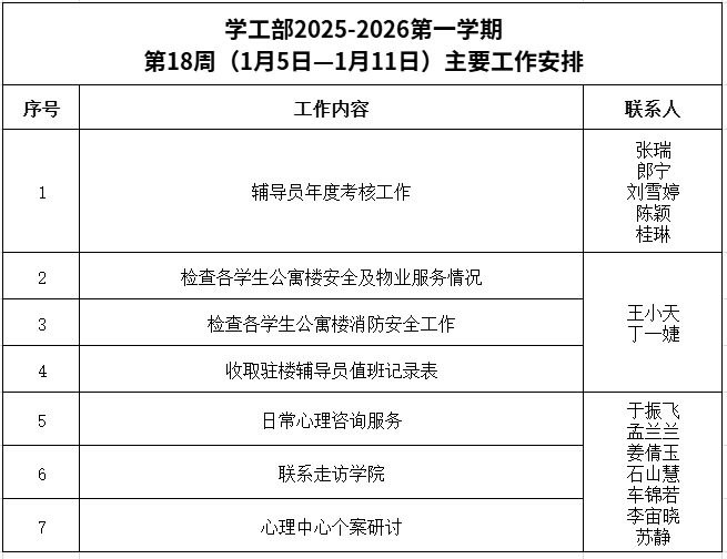 学工部2025-2026第一学期第18周(1月5日-1月11日)主要工作安排