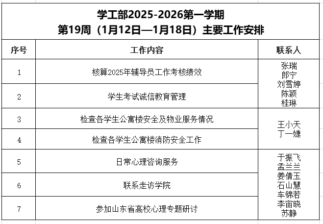 学工部2025-2026第一学期第19周(1月12日-1月18日)主要工作安排