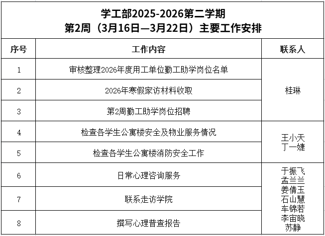 学工部2025-2026第二学期第2周(3月16日-3月22日)主要工作安排
