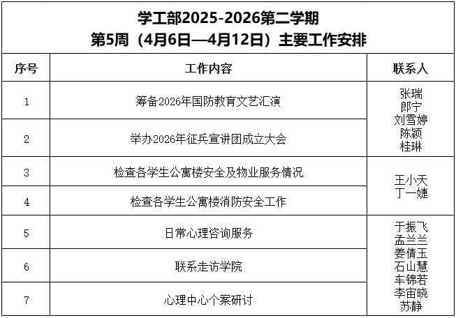 学工部2025-2026第二学期第5周(4月6日-4月12日)主要工作安排