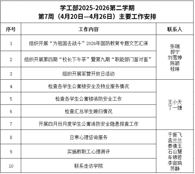 学工部2025-2026第二学期第7周(4月20日-4月26日)主要工作安排